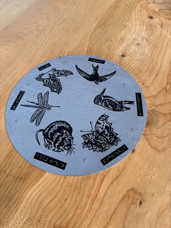 Enhancing both accessibility and learning opportunities, the centre of the table features six engraved wildlife illustrations, each accompanied by braille. These tactile engravings highlight some of the species commonly found at the reserve, including the Kingfisher and Water Vole, offering a valuable sensory experience for visitors.